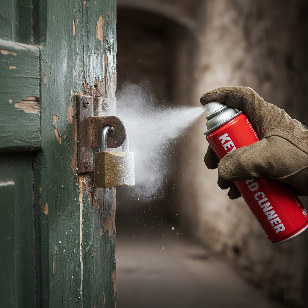 The Freeze: As that liquid hits the air and evaporates, it drops the temperature instantly to around -50°F (-45°C). He sprays it directly into the shackle of the padlock for about 20 seconds. frost forms. The metal groans.